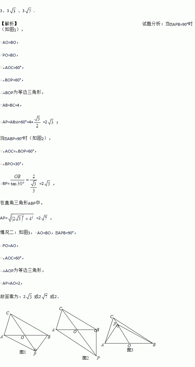 如图,在△ABC中,AB=BC=6,AO=BO,P是射线CO上的一个动点,∠AOC=60°,则当△PAB为直角三角形时,AP的长为 ________________.
