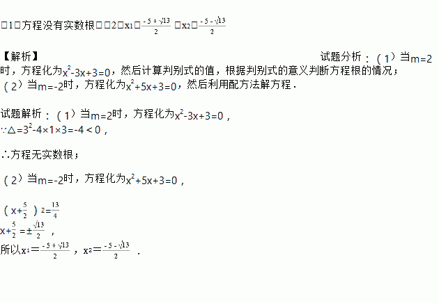 (1)方程没有实数根;(2)x1=,x2= 【解析】试题分析:(1)当m=2时,方程化为x2-3x+3=0,然后计算判别式的值,根据判别式的意义判断方程根的情况; (2)当m=-2时,方程化为x2+5x+3=0,然后利用配方法解方程. 试题解析:(1)当m=2时,方程化为x2-3x+3=0, ∵△=32-4×1×3=-4<0, ∴方程无实数根; (2)当m=-2时,方程化为x2...