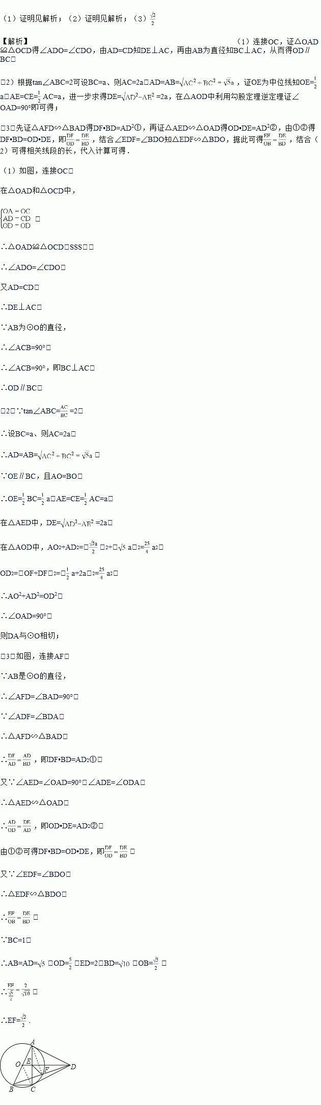 (2)若tan∠ABC=2,证明:DA与⊙O相切;