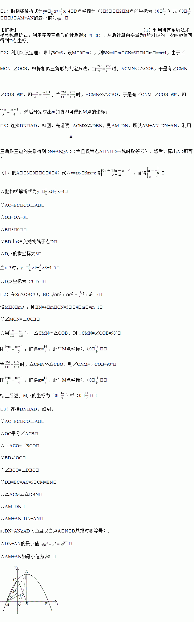 如图,抛物线y=ax2﹣5ax+c与坐标轴分别交于点A,C,E三点,其中A(﹣3,0),C(0,4),点B在x轴上,AC=BC,过点B作BD⊥x轴交抛物线于点D,点M,N分别是线段CO,BC上的动点,且CM=BN,连接MN,AM,AN.
