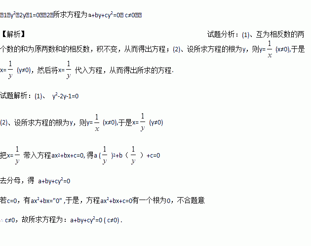 (2)已知关于x的一元二次方程ax2+bx+c=0(a≠0)有两个不等于零的实数根,求一个一元二次方程,使它的根分别是已知方程根的倒数.