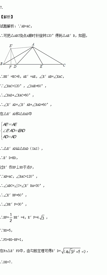 如图△ABC中,AB=AC,∠BAC=120°,∠DAE=60°,BD=5,CE=8,则DE的长为 .