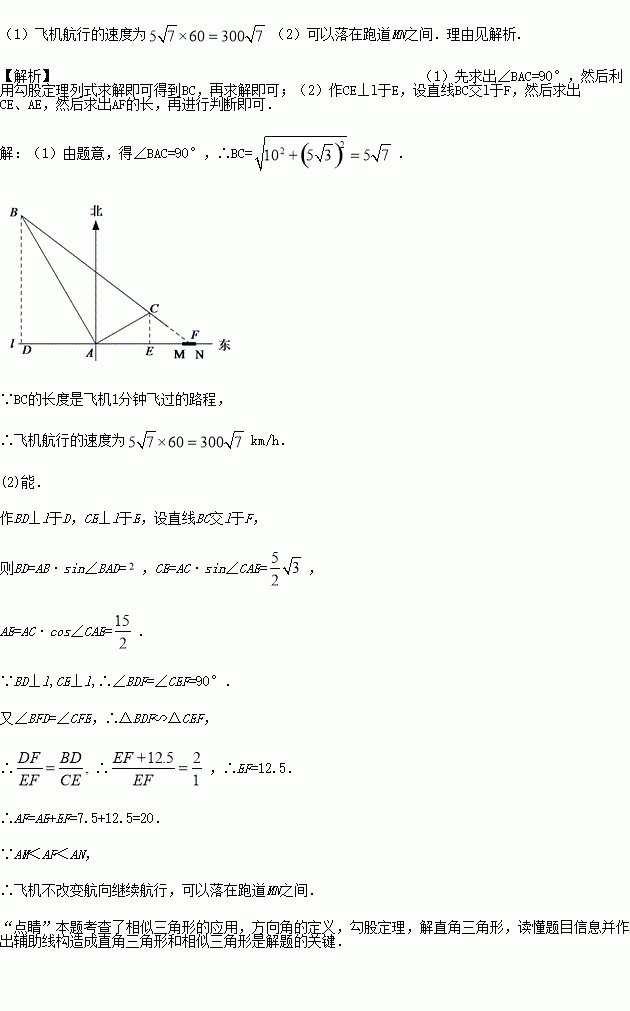 有一长为1km的飞机跑道MN(如图),在跑道西端M 的正西19.5km 处有一观察站A.某时刻测得一架匀速直线降落的飞机位于A 的北偏西30°,且与A相距10km的B处;经过1分钟,又测得该飞机位于A的北偏东60°,且与A相距5
