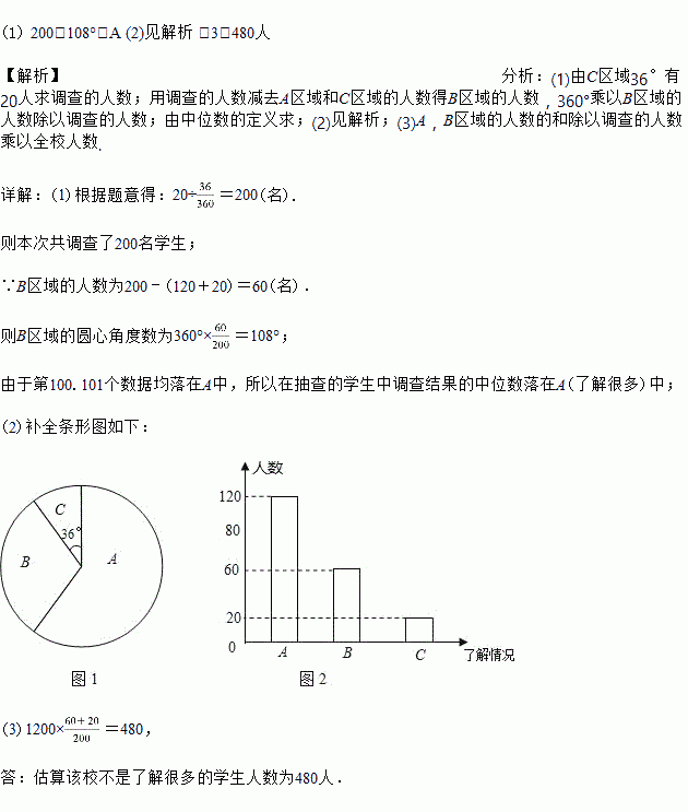 (1)求本次活动共调查了 名学生;图1中,B区域的圆心角度是 ;在抽取的学生中调查结果的中位数落在 区域里.