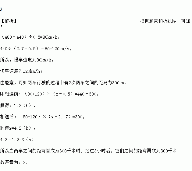 一列快车从甲地匀速驶往乙地,一列慢车从乙地匀速驶往甲地.设先发车辆行驶的时间为x小时,两车之间的距离为y千米,图中的折线表示y与x之间的函数关系.当两车之间的距离首次为300千米时,经过_____小时后,它们之间的距离再次为300千米.