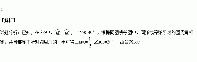 如图,在⊙O中,=,∠AOB=40°,则∠ADC的度数是( )