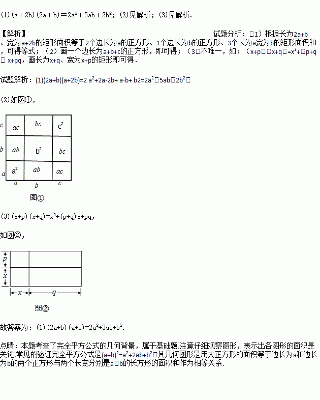我们已经知道,多项式与多项式相乘的法则可以用平面几何图形的面积来表示,实际上还有一些代数恒等式也可以用这种形式表示.例如:(2a+b) (a+b)=2a2+3ab+b2就可以用图①或图②等图形的面积来表示.