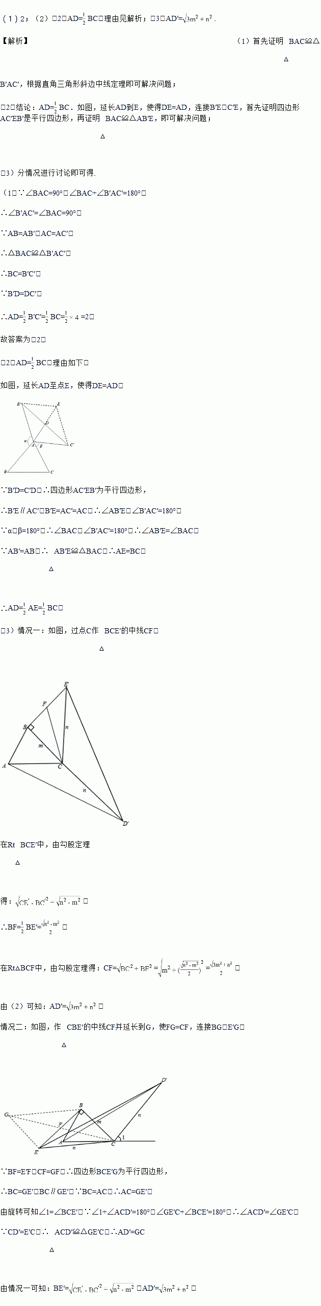 (3)如图③,已知等腰△ACB,AC=BC=m,延长AC到D,延长CB到E,使CD=CE=n,将△CED绕C顺时针旋转一周得到△CE′D′,连接BE′、AD′,若∠CBE′=90°,求AD′的长度(用含m、n的代数式表示).