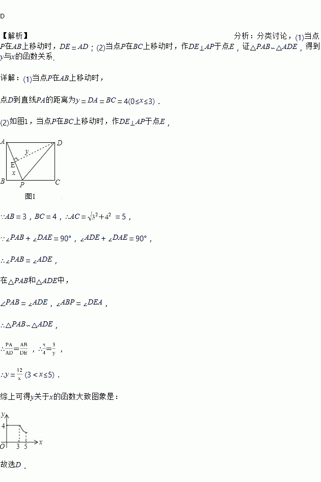 如图,矩形ABCD中,AB=3,BC=4,点P从A点出发,按A→B→C的方向在AB和BC上移动.记PA=x,点D到直线PA的距离为y,则y关于x的函数大致图象是( )