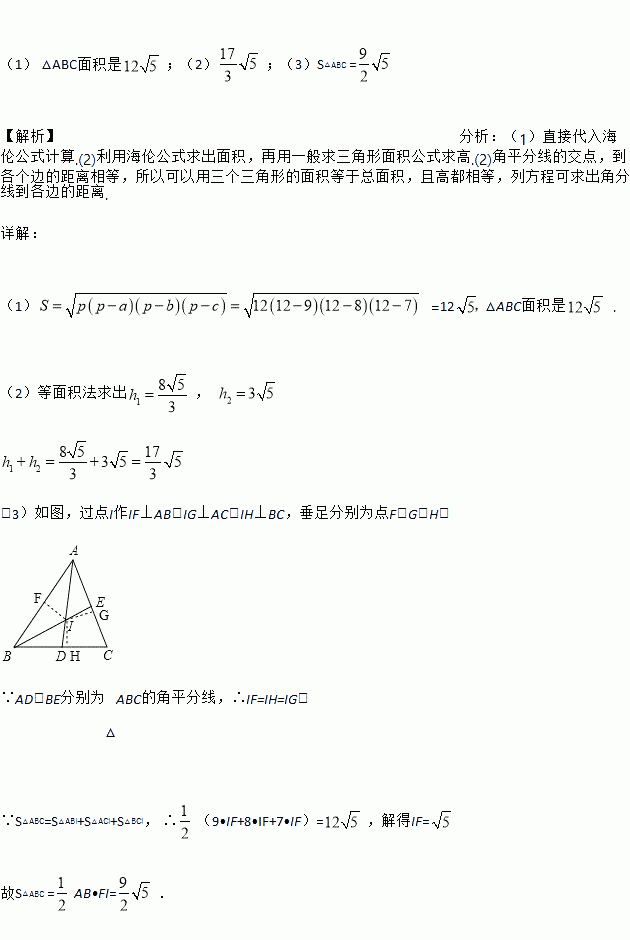 (3)如图2,AD、BE为△ABC的两条角平分线,它们的交点为I,求△ABI的面积.