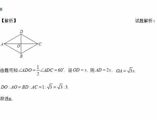 在菱形ABCD中,若∠ADC=120°,则BD:AC等于 ( )