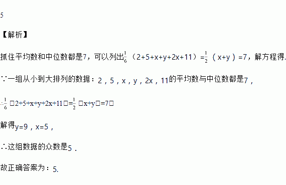 已知一组从小到大排列的数据:2,5,x,y,2x,11的平均数与中位数都是7,则这组数据的众数是_____.