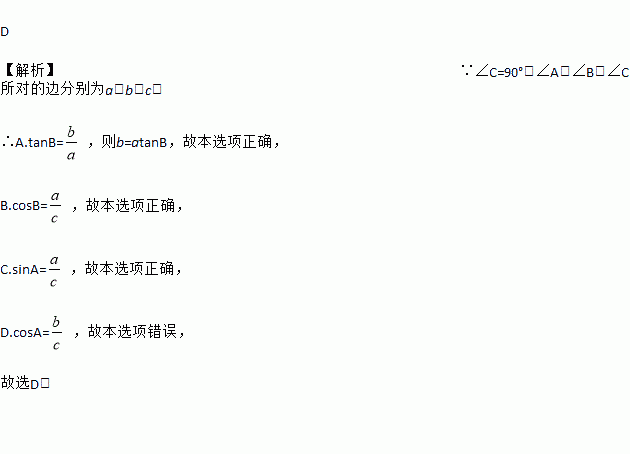 A. b=atanB B. a=ccosB C. c=