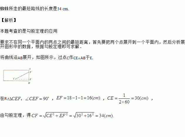 如图,圆柱形无盖玻璃容器,高18cm,底面周长为60cm,在外侧距下底1cm的点C处有一蜘蛛,与蜘蛛相对的圆柱形容器的上口外侧距开口1cm的F处有一苍蝇,试求急于捕获苍蝇充饥的蜘蛛所走的最短路线的长度.