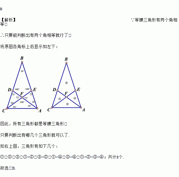 △ABC中,AB=AC,∠A=36°,∠ABC和∠ACB的平分线BE、CD交于点F,则共有等腰三角形( )