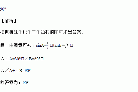 已知|sinA﹣|+=0,那么∠A+∠B= .