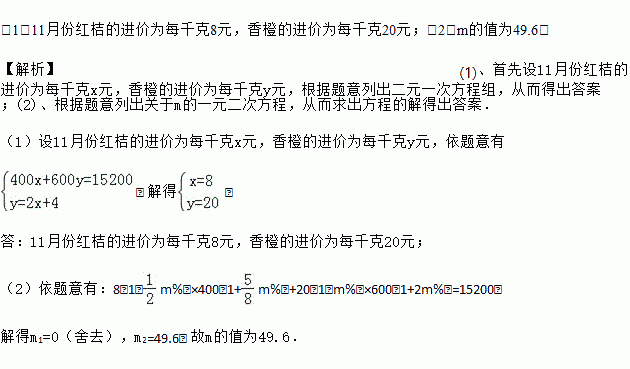 (2)时下正值柑橘销售旺季,水果店老板决定在12月份继续购进这两种水果,但进入12月份,由于柑橘的大量上市,红桔和香橙的进价都有大幅下滑,红桔每千克的进价在11月份的基础上下降了