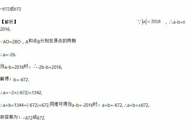 在数轴上,点A和点B分别表示数a和b,且在原点的两侧,若=2016,AO=2BO,则a+b=_____