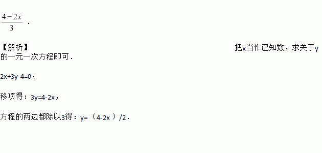 . 【解析】把x当作已知数,求关于y的一元一次方程即可. 2x+3y-4=0, 移项得:3y=4-2x, 方程的两边都除以3得:y= (4-2x )/2.