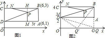 分析:(1)当t=1时,AM=3×1=3,得到M点为AD的中点,则P点为DB的中点,即可得到P点坐标为(3,2);