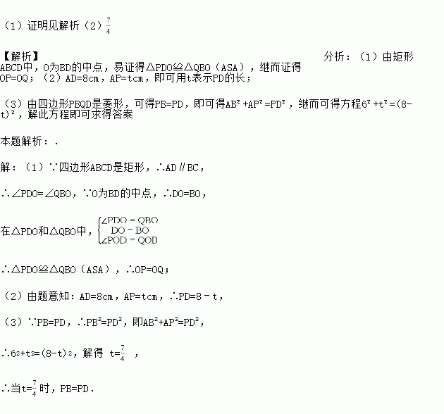 (2)若AD=8cm,AB=6cm,P从点A出发,以1cm/秒的速度向点D运动(不与点D重合),设点P运动时间为t秒,请用t表示PD的长;并求当t为何值时,四边形PBQD是菱形。