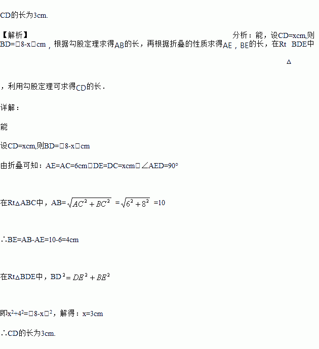 如图,有一个直角三角形纸片,两直角边AC=6cm,BC=8cm,现将直角边AC沿直线AD折叠,使它落在斜边AB上,且与AE重合,你能求出CD的长吗?若能,请给出求解过程.