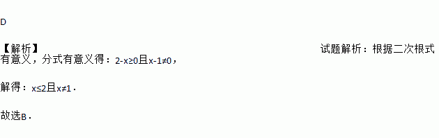 D 【解析】试题解析:根据二次根式有意义,分式有意义得:2-x≥0且x-1≠0, 解得:x≤2且x≠1. 故选B.