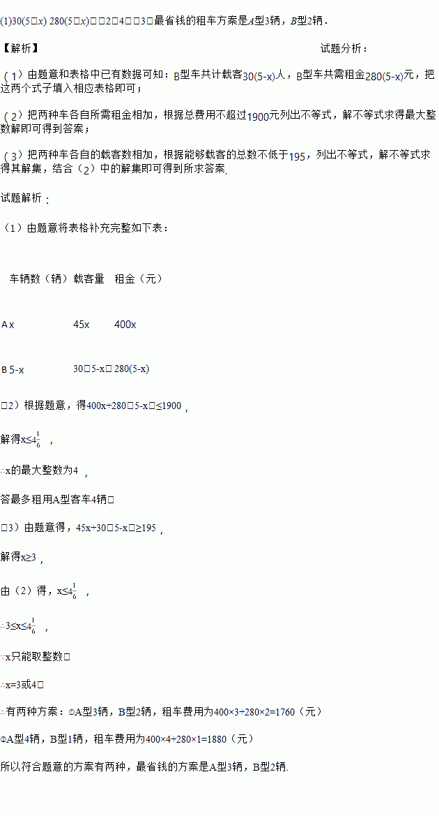 (1)30(5-x) 280(5-x);(2)4;(3)最省钱的租车方案是A型3辆,B型2辆. 【解析】试题分析: (1)由题意和表格中已有数据可知:B型车共计载客30(5-x)人,B型车共需租金280(5-x)元,把这两个式子填入相应表格即可; (2)把两种车各自所需租金相加,根据总费用不超过1900元列出不等式,解不等式求得最大整数解即可得到答案; (3)把两种车各自的...