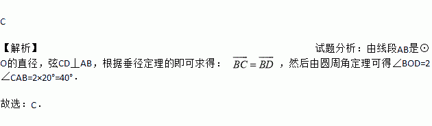 C 【解析】试题分析:由线段AB是⊙O的直径,弦CD丄AB,根据垂径定理的即可求得: ,然后由圆周角定理可得∠BOD=2∠CAB=2×20°=40°. 故选:C.