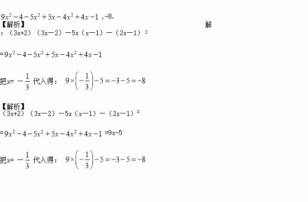 先化简,再求值: (3x+2)(3x—2)—5x(x—1)—(2x—1) ,其中x= —