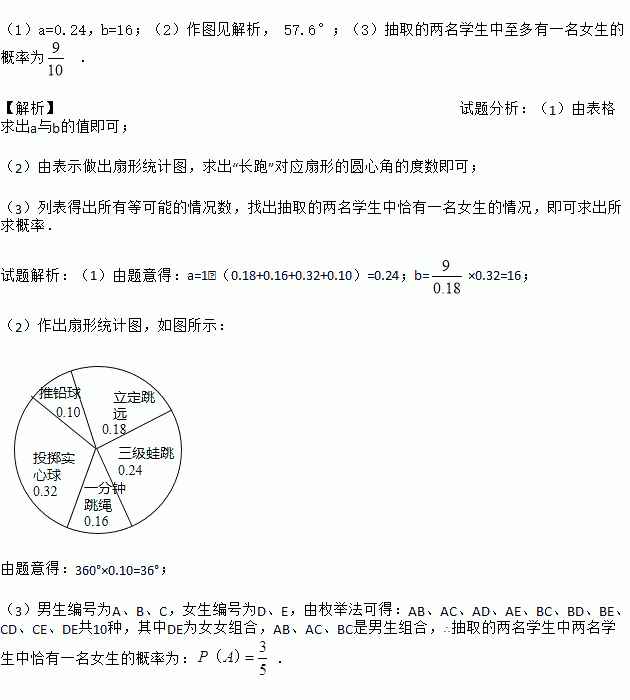 (3)在选报“推铅球”的学生中,有3名男生,2名女生,为了了解学生的训练效果,从这5名学生中随机抽取两名学生进行推铅球测试,求所抽取的两名学生中至多有一名女生的概率.