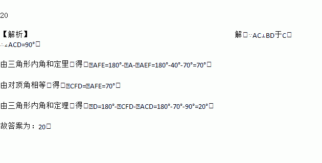 如图,AC⊥BD于点C,已知∠A=40°,∠AEF=70°,则∠D=_______