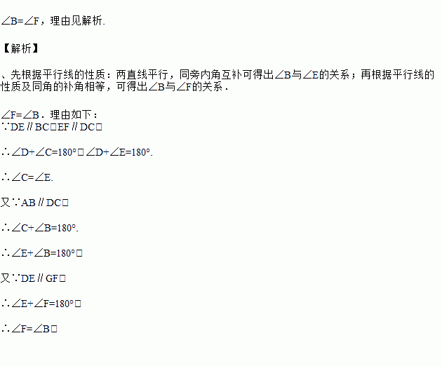如图,是小明养的小乌龟身体上的一块花纹,DE∥GF∥BC,DC∥EF∥AB,你能知道∠B和∠F的关系吗?说说你的理由.