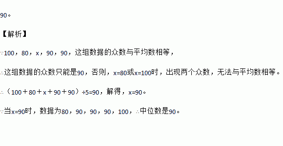 张老师对同学们的打字能力进行测试,他将全班同学分成五组.经统计,这五个小组平均每分钟打字个数如下:100,80,x,90,90,已知这组数据的众数与平均数相等,那么这组数据的中位数是 .