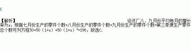 某机械厂七月份生产零件50万个,第三季度生产零件196万个.设该厂八、九月份平均每月的增长率为x,那么x满足的方程是( )
