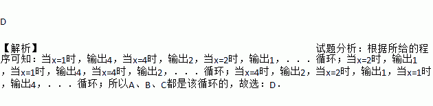 D ¡¾½âÎö¡¿ÊÔÌâ·ÖÎö£º¸ù¾ÝËù¸øµÄ³ÌÐò¿ÉÖª£ºµ±x=1ʱ£¬Êä³ö4£¬µ±x=4ʱ£¬Êä³ö2£¬µ±x=2ʱ£¬Êä³ö1£¬£®£®£®Ñ»·£»µ±x=2ʱ£¬Êä³ö1£¬µ±x=1ʱ£¬Êä³ö4£¬µ±x=4ʱ£¬Êä³ö2£¬£®£®£®Ñ»·£»µ±x=4ʱ£¬Êä³ö2£¬µ±x=2ʱ£¬Êä³ö1£¬µ±x=1ʱ£¬Êä³ö4£¬£®£®£®Ñ»·£»ËùÒÔA¡¢B¡¢C¶¼ÊǸÃÑ»·µÄ£¬¹ÊÑ¡£ºD£®