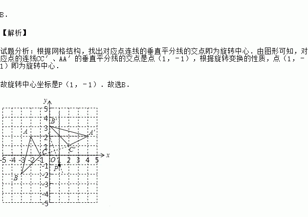 B. 【解析】 试题分析:根据网格结构,找出对应点连线的垂直平分线的交点即为旋转中心.由图形可知,对应点的连线CC′、AA′的垂直平分线的交点是点(1,﹣1),根据旋转变换的性质,点(1,﹣1)即为旋转中心. 故旋转中心坐标是P(1,﹣1).故选B.