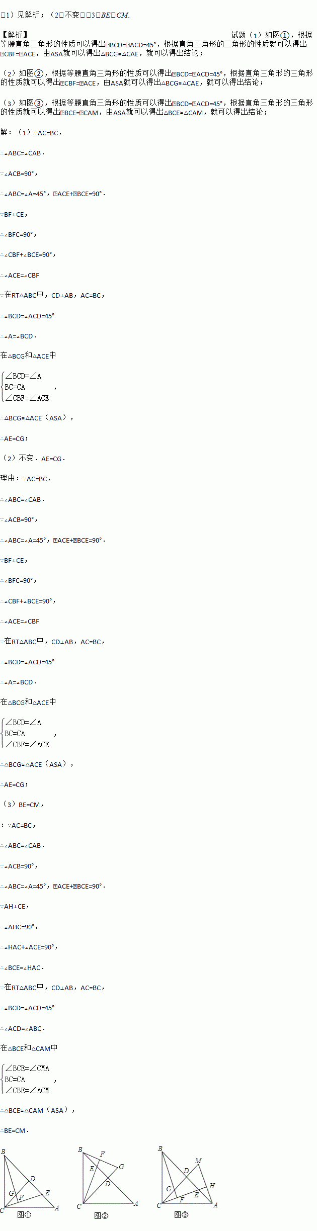如图①,在△ABC中,AC=BC,∠ACB=90°,过点C作CD⊥AB于点D,点E是AB边上一动点(不含端点A,B),连接CE,过点B作CE的垂线交直线CE于点F,交直线CD于点G.