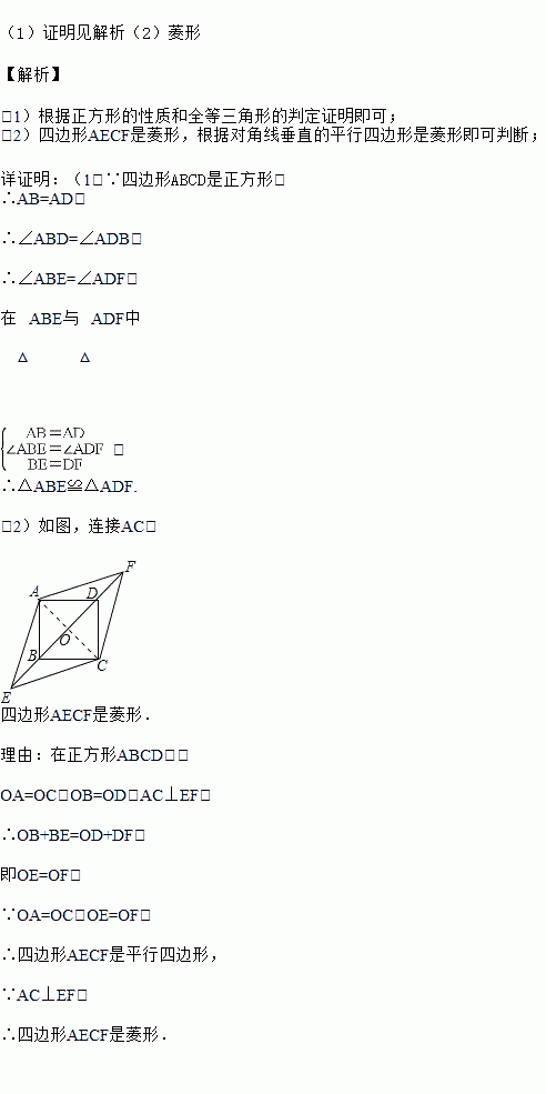 在正方形ABCD中,对角线BD所在的直线上有两点E、F满足BE=DF,连接AE、AF、CE、CF,如图所示.