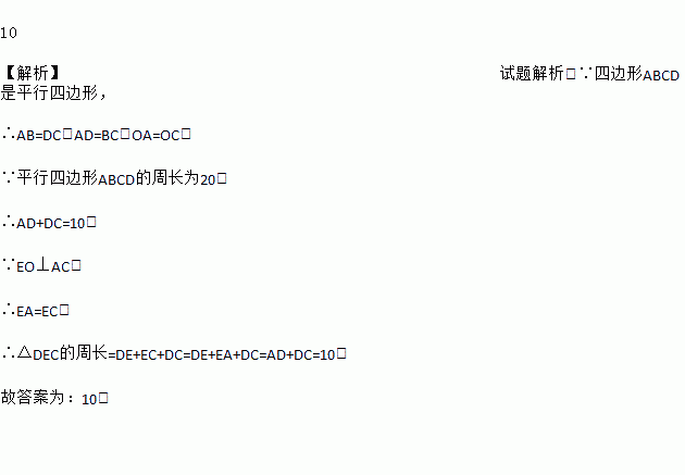 如图,已知平行四边形ABCD的周长为20,对角线AC,BD相交于点O,过O作EO⊥AC,连接EC,则△DEC的周长为________ .