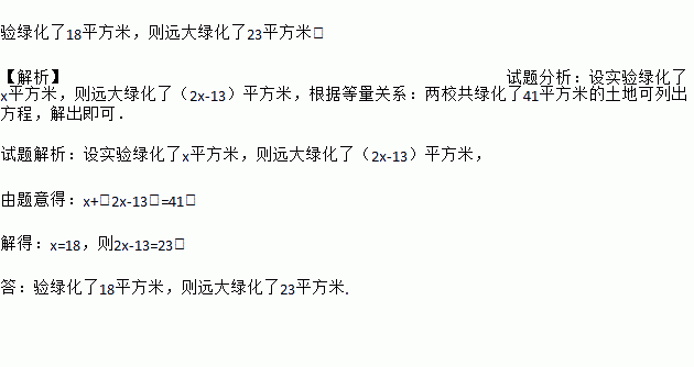 验绿化了18平方米,则远大绿化了23平方米。 【解析】试题分析:设实验绿化了x平方米,则远大绿化了(2x-13)平方米,根据等量关系:两校共绿化了41平方米的土地可列出方程,解出即可. 试题解析:设实验绿化了x平方米,则远大绿化了(2x-13)平方米, 由题意得:x+(2x-13)=41, 解得:x=18,则2x-13=23. 答:验绿化了18平方米,则远大绿化了23...