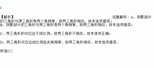 (2016河北省)如图,△ABC中,∠A=78°,AB=4,AC=6.将△ABC沿图示中的虚线剪开,剪下的阴影三角形与原三角形不相似的是( )