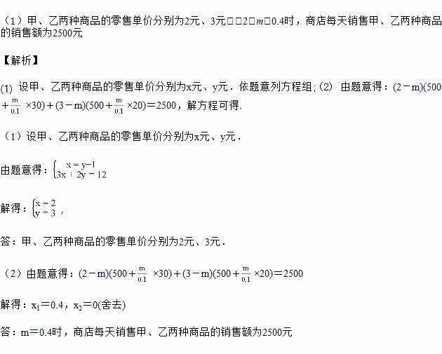 (2)该商店平均每天卖出甲、乙两种商品各500件,经调查发现,两种商品零售单价每降0.1元,甲种商品每天可多销售30件,乙种商品每天可多销售20件,商店决定把两种商品的零售单价均下降m(0<m<1)元.在不考虑其他因素的条件下,当m为多少时,商店每天销售甲、乙两种商品的销售额之和为2500元?