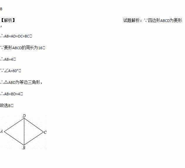 菱形ABCD的周长为16,∠A=60°,则BD的长为( )