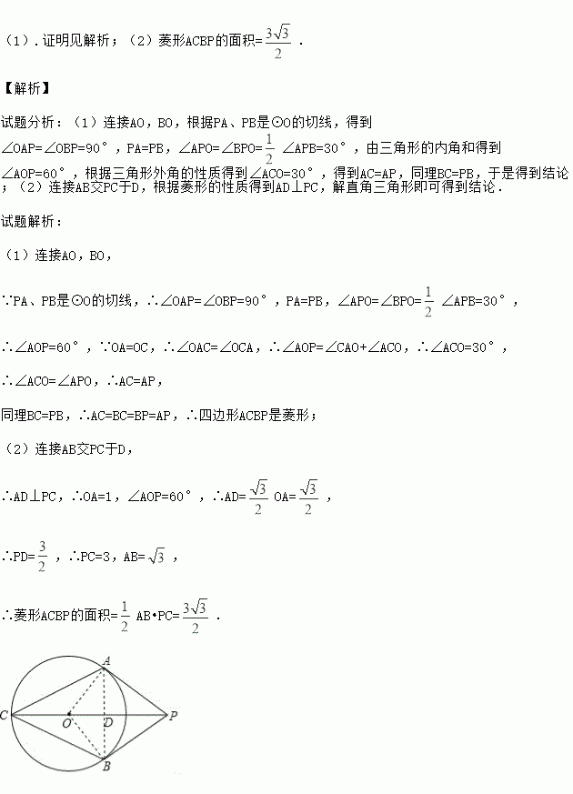 (2)若⊙O半径为1,求菱形ACBP的面积.