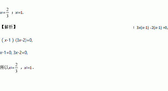 x1=;x2=1. 【解析】:3x(x-1) -2(x-1) =0, (x-1)(3x-2)=0, x-1=0, 3x-2=0, 所以x1=,x2=1.