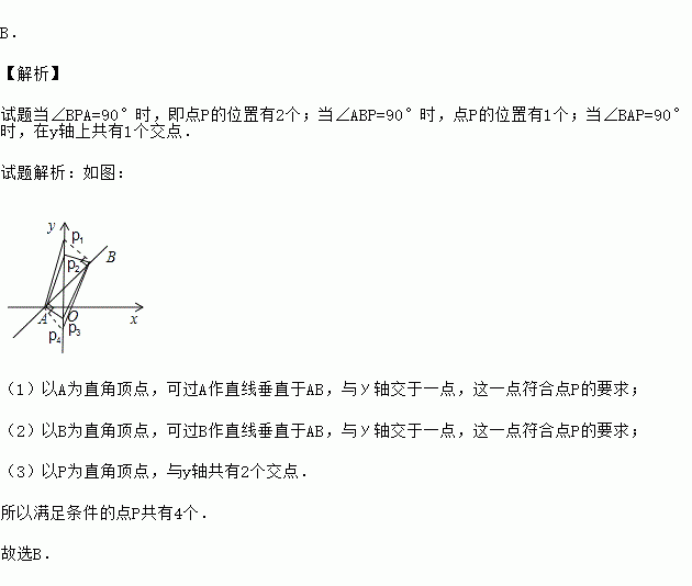 如图,已知点A(-1,0)和点B(1,2),在y轴上确定点P,使得△ABP为直角三角形,则满足条件的点P共有( )
