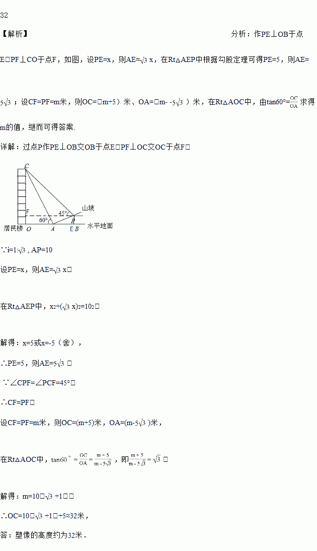 ,小亮在距山坡坡脚A处测得楼顶C 的仰角为60°,当从A 处沿坡面行走10米到达P处时,测得楼顶C的仰角刚好为 45°,点 O,A,B 在同一直线上,求该居民楼的高度.(结果保留整数,