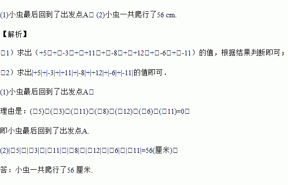 一只小虫沿一根东西方向放着的木杆爬行,小虫从某点A出发在木杆上来回爬行7次,如果向东爬行的路程记为正数,向西爬行的路程记为负数,爬行过的各段路程依次如下(单位:cm):
