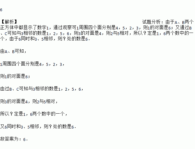 一个立方体的每个面上都标有数字1、2、3、4、5、6,根据图中该立方体A、B、C三种状态所显示的数字,可推出“?”处的数字是